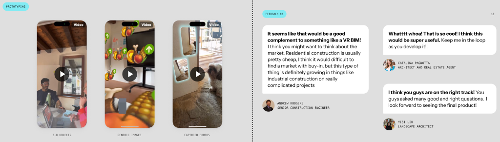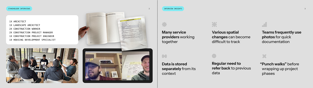 Why: The idea emerged from conversations with a range of people in the construction industry — from engineering managers and architects to builders on site. The team discovered that plans frequently shift, and project leaders often rely on historical context to make decisions. Existing workflows either involved very manual methods, like weekly photo-walks and spreadsheets, or expensive, high-end tools. While many workers were hesitant to adopt new technology, one common behavior stood out: sending progress photos via mobile phones. Some tradespeople even physically mark their work areas using colored tape or ribbons.