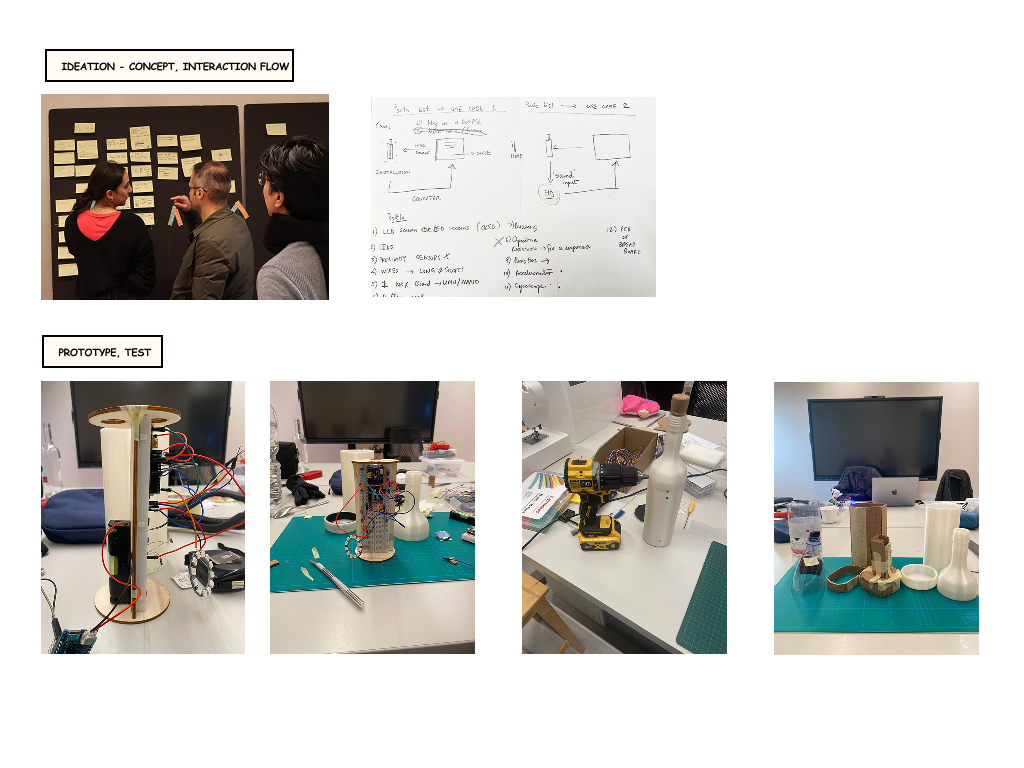 What: Messages in a Bottle is an art installation that reimagines the age-old tradition of maritime message-sharing, transforming anonymous storytelling into a captivating phy-digital experience. Individuals can share their deepest secrets or messages through an online platform, and these messages appear on an OLED screen inside a carefully crafted bottle. Everytime someone picks up the bottle, the message changes and a blue light appears as feedback for the viewer.