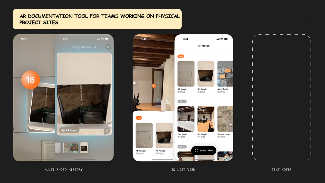 How: This revealed an opportunity to build a tool that sits between complex BIM systems and ad-hoc methods. OnSight makes images accessible exactly where and when they’re needed. It builds on existing habits: simply open the app, tap the screen, and a photo is both captured and pinned in space. Later, anyone on the team can open the app and view it in the same physical location.