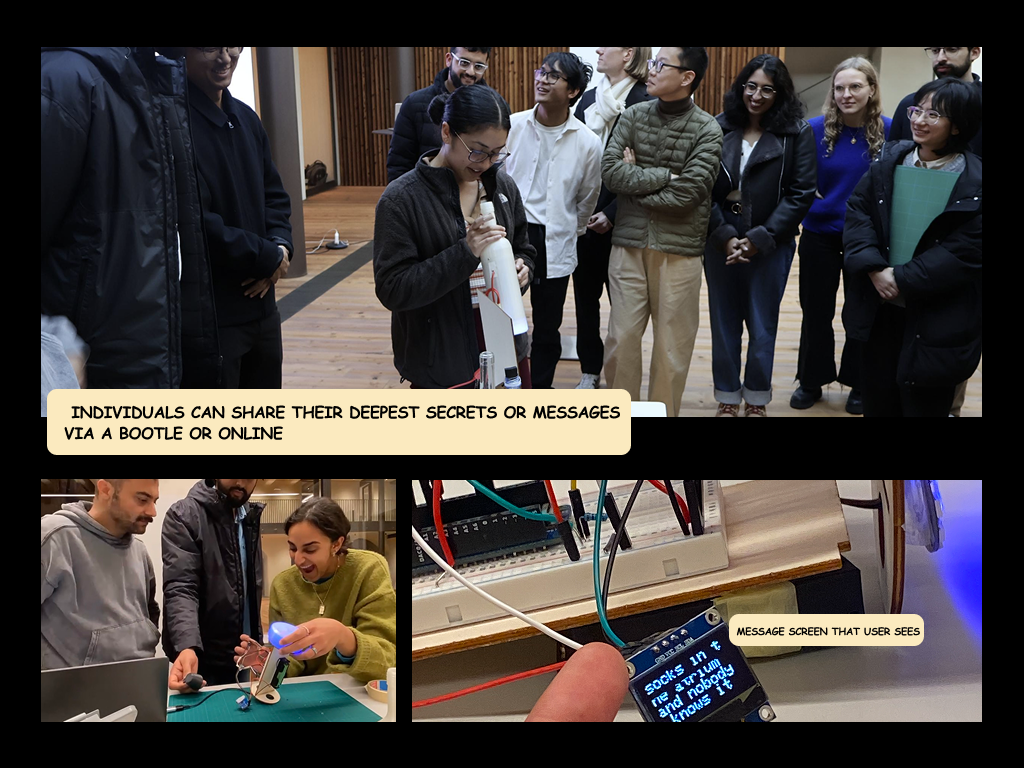 What: Messages in a Bottle is an art installation that reimagines the age-old tradition of maritime message-sharing, transforming anonymous storytelling into a captivating phy-digital experience. Individuals can share their deepest secrets or messages through an online platform, and these messages appear on an OLED screen inside a carefully crafted bottle. Everytime someone picks up the bottle, the message changes and a blue light appears as feedback for the viewer.